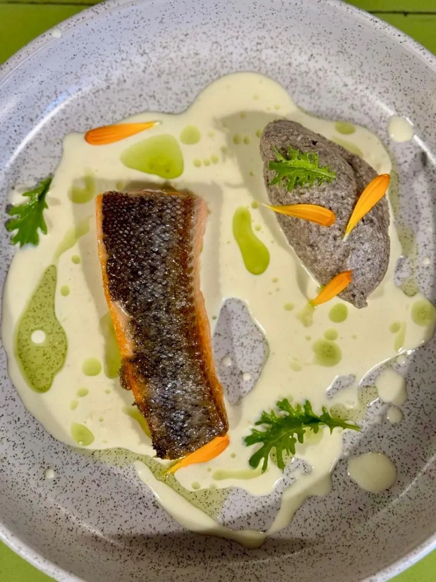 “Nos tocó elaborar platos con productos regionales: trabajamos en un plato de ciervo con una demiglace de sauco y una manteca de tuétano y hierbas, más una espuma de papa; y también en un lomo de trucha con una crema inglesa de raíz picante, y una quenel de morillas y manzanas verdes”, comentó Marchant.