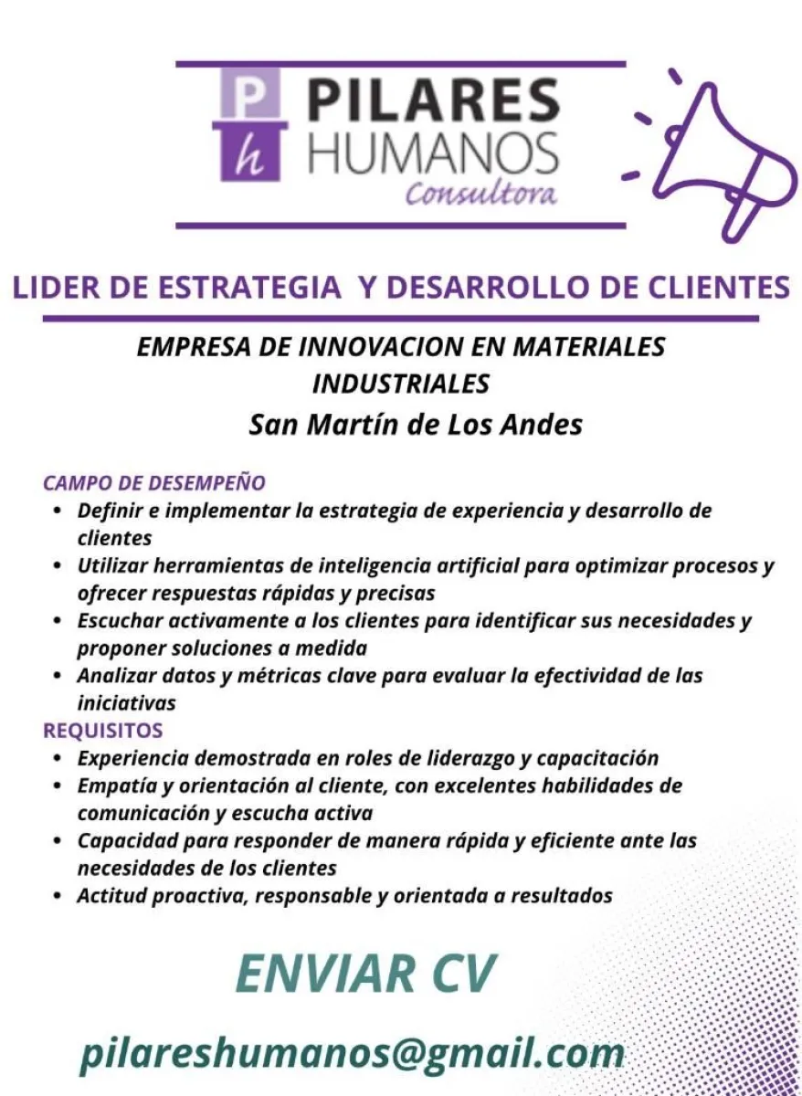 Aviso laboral Lider de estrategia y desarrollo de clientes BOLSA DE TRABAJO 01/03/2025 Te puede interesar Aviso laboral Cargo en Centro de Formación Profesional N° 19 Aviso laboral Eléctrico de obra Aviso laboral Camarero para Loi suites Chapelco hotel Aviso laboral Vendedor Aviso laboral Chofer de taxi Avisos laborales Personal para Unser Traum Avisos laborales Gerente - Encargado/a - Vendedor/a Aviso laboral Personal para parque y tareas varias en estancia Últimas noticias Ajedrez Peón en Séptima dirá presente en el Argentino de Menores con Morena Cesar representando a Neuquén Destacado Capacitación en derechos ciudadanos: convocan a vecinos a participar de encuentros gratuitos en San Martín Cultura Espacio Trama renueva su cartelera este fin de semana con música, teatro y magia para todos los gustos Fauna silvestre Atropellan a una puma preñada en la Ruta 40 dentro del Parque Nacional Nahuel Huapi Ampliación del aeropuerto Chapelco Saloniti destacó la inversión provincial y el impacto regional de la obra Calendario religioso Qué se conmemora el Jueves Santo