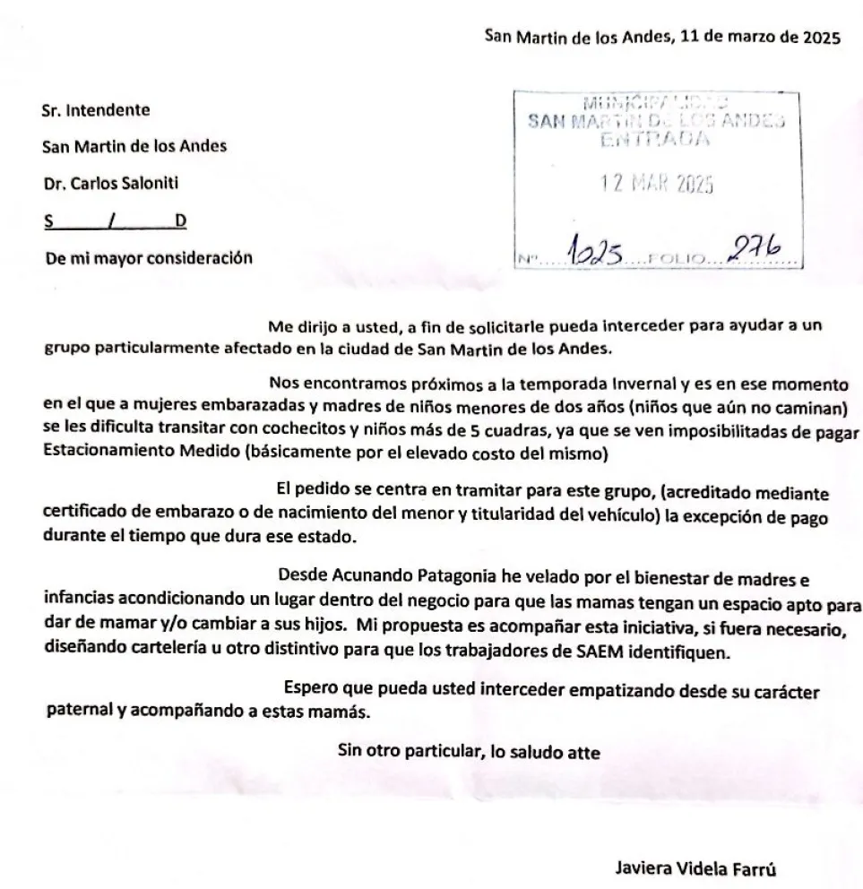 De la cara a la temporada invernal, Javiera Videla, de Acunando Patagonia, redactó una carta dirigida al intendente Carlos Saloniti, en la que le solicita exceptuar del estacionamiento medido a mujeres embarazadas o madres de niños de hasta dos años. En el texto explica que sería una ayuda importante para que las madres que no pueden afrontar el gasto del estacionamiento medido, no tengan que caminar tantas cuadras con sus hijos durante el clima hostil del invierno.