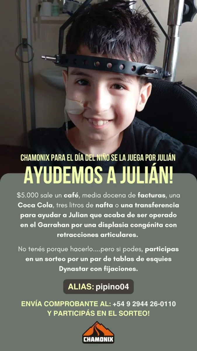 Ante esta situación, vecinos, comercios y emprendedores locales pusieron en marcha una campaña solidaria. Entre las acciones, la tienda Chamonix, por el Día del Niño, sorteará un par de esquíes Dynastar con fijaciones entre quienes realicen un aporte de $5.000. “Esa suma es lo que puede costar un café con medialunas, tres litros de nafta o una Coca Cola. Con ese mismo valor se puede ayudar a Julián”, señalaron desde la organización.