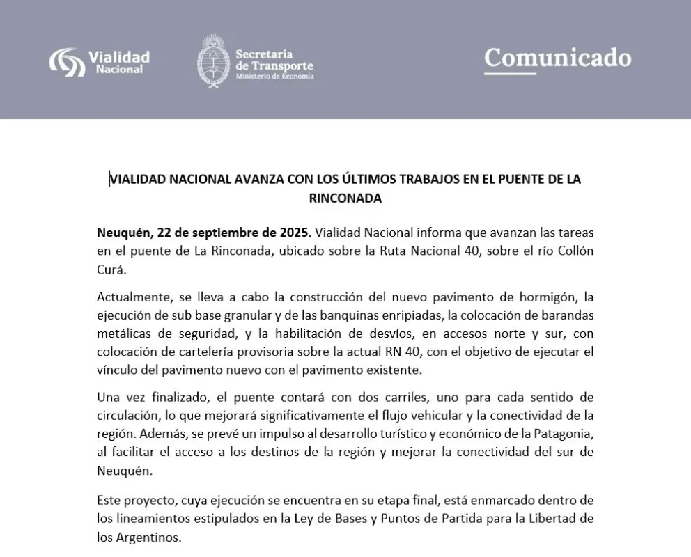 Una vez finalizado, el puente contará con dos carriles, uno por cada sentido de circulación, lo que permitirá mejorar de manera significativa el flujo vehicular y la conectividad en la región. El organismo destacó que la obra tendrá un fuerte impacto en el desarrollo turístico y económico de la Patagonia, al facilitar el acceso a los destinos de la zona y fortalecer la conexión vial del sur neuquino.