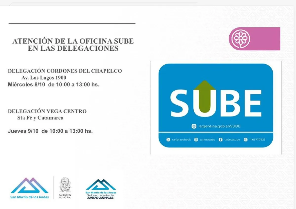 La Oficina SUBE de San Martín de los Andes solicita a los vecinos y vecinas que se presenten en las delegaciones habilitadas para la atención de trámites relacionados con la tarjeta SUBE.