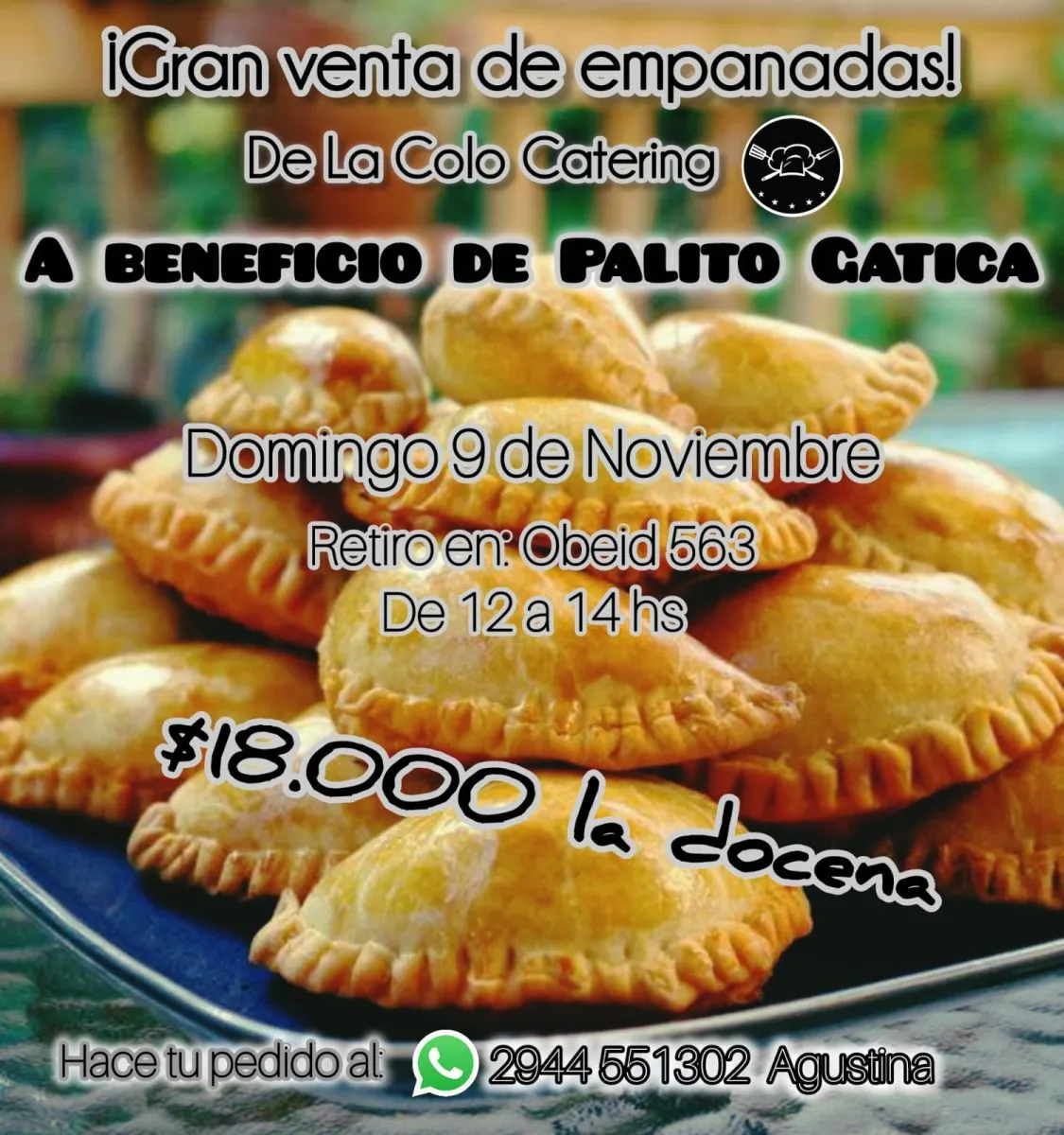 Ante la imposibilidad de que Palito trabaje, el próximo domingo 9 de noviembre se llevará adelante una venta solidaria de empanadas elaboradas por La Colo Catering. La docena tendrá un valor de $18.000 y podrá retirarse entre las 12 y las 14 horas en Obeid 563.