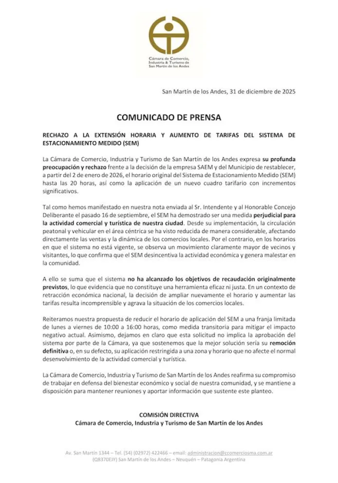 La Cámara de Comercio, Industria y Turismo de San Martín de los Andes manifestó su rechazo a la decisión de restablecer el horario original del Sistema de Estacionamiento Medido (SEM) hasta las 20 horas y de aplicar un nuevo cuadro tarifario con aumentos, medidas que comenzarán a regir a partir del 2 de enero de 2026.