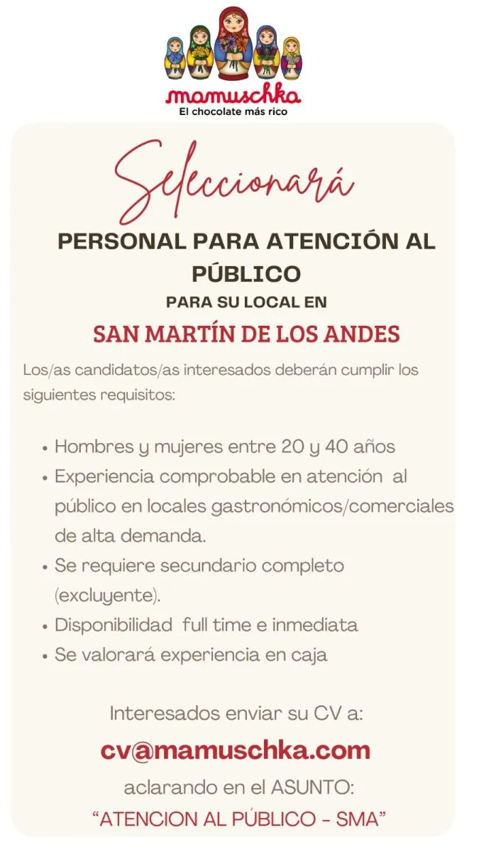 Aviso laboral Personal para atención al público de Mamuschka BOLSA DE TRABAJO 07/01/2026 Te puede interesar Aviso laboral Chofer de taxi Aviso laboral Empleado/a para heladería Aviso laboral Personal administrativo para Préstamos Valor Global Aviso laboral Ayudante de cocina para Hotel Patagonia Plaza Aviso laboral Personal masculino para comercio Aviso laboral Medio jornada recepción Aviso laboral Personal de limpieza Aviso laboral Chofer de taxi Últimas noticias Conflicto gremial destrabado Tras una reunión con el intendente Saloniti, se normalizan los servicios municipales en San Martín de los Andes Conflicto institucional en el fútbol argentino La AFA anunció un paro de cuatro días y suspendió la fecha 9 de la Liga Profesional Siniestro vial en la cordillera Fatal choque en la Ruta 60: una mujer murió y cuatro personas resultaron gravemente heridas Infraestructura rural Neuquén espera la autorización nacional para iniciar la pasarela sobre el Cuyín Manzano Pronóstico regional Ingresa aire frío y húmedo en la cordillera y anticipan lluvias hacia fin de mes Aviso laboral Chofer de taxi