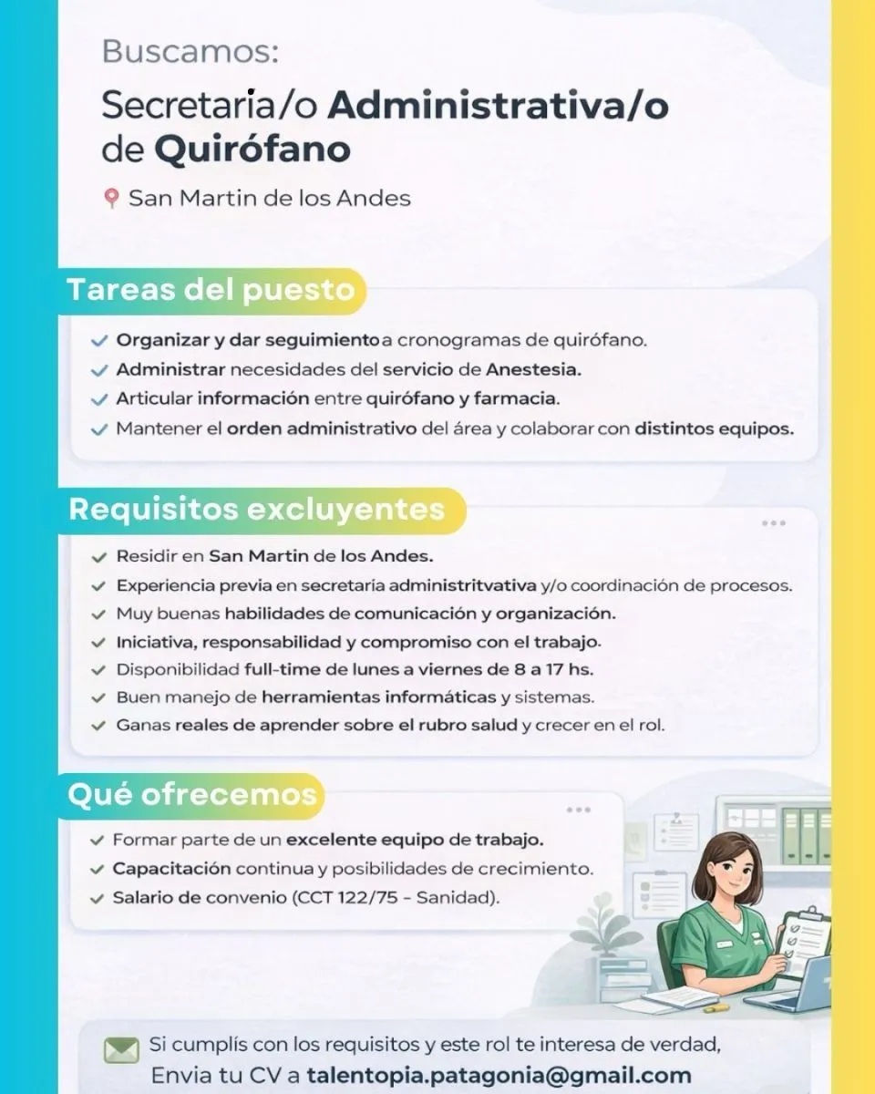 Aviso laboral Administrativa/o de quirófano BOLSA DE TRABAJO 07/01/2026 Temas San Martín de los Andes Te puede interesar Aviso laboral Chofer de taxi Aviso laboral Empleado/a para heladería Aviso laboral Personal administrativo para Préstamos Valor Global Aviso laboral Ayudante de cocina para Hotel Patagonia Plaza Aviso laboral Personal masculino para comercio Aviso laboral Medio jornada recepción Aviso laboral Personal de limpieza Aviso laboral Chofer de taxi Últimas noticias Conflicto institucional en el fútbol argentino La AFA anunció un paro de cuatro días y suspendió la fecha 9 de la Liga Profesional Siniestro vial en la cordillera Fatal choque en la Ruta 60: una mujer murió y cuatro personas resultaron gravemente heridas Infraestructura rural Neuquén espera la autorización nacional para iniciar la pasarela sobre el Cuyín Manzano Pronóstico regional Ingresa aire frío y húmedo en la cordillera y anticipan lluvias hacia fin de mes Aviso laboral Chofer de taxi