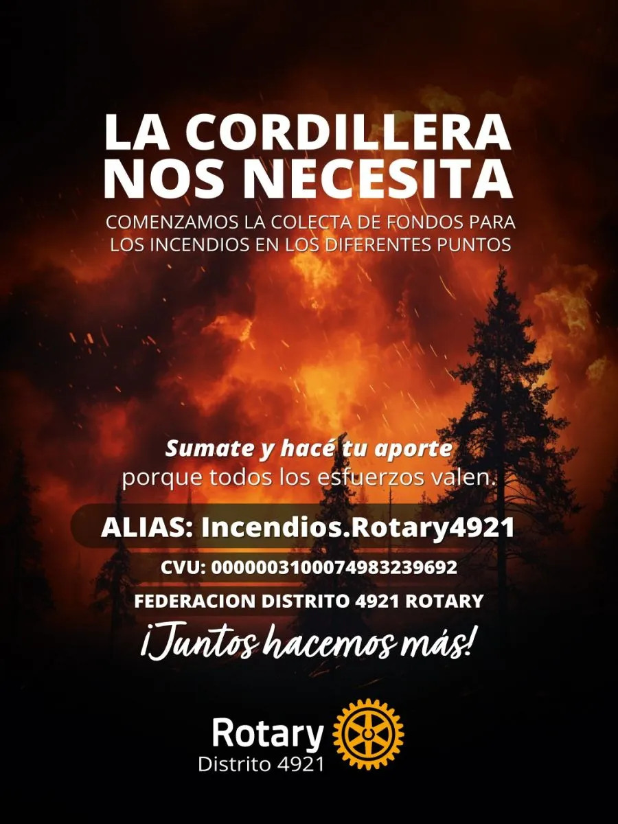 Frente a la crítica situación que atraviesa la cordillera por los incendios forestales, el Distrito 4921 de Rotary puso en marcha una colecta solidaria destinada a acompañar a las comunidades afectadas. La iniciativa busca canalizar aportes económicos para brindar asistencia en un contexto marcado por la emergencia y el impacto ambiental.