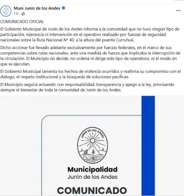 El Gobierno Municipal de Junín de los Andes informó que no tuvo ningún tipo de participación, injerencia ni intervención en el operativo realizado por fuerzas de seguridad nacionales sobre la Ruta Nacional N° 40, a la altura del puente Curruhuë.