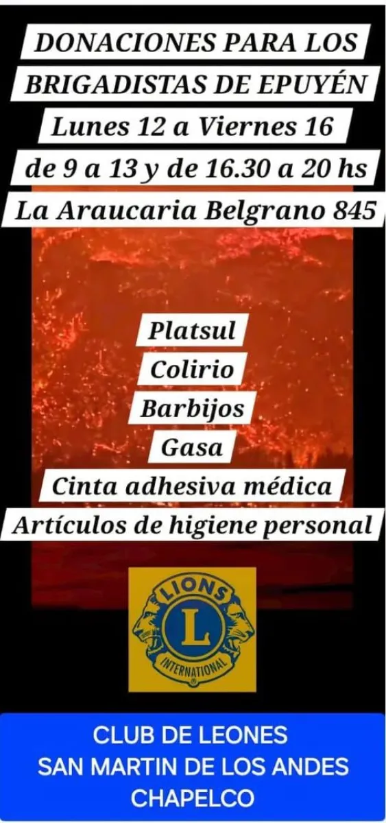 El Club de Leones San Martín de los Andes – Chapelco lanzó una campaña solidaria para reunir donaciones destinadas a los brigadistas que trabajan en Epuyén. La colecta se realizará desde el lunes 12 hasta el viernes 16, en el horario de 9 a 13 hs y de 16.30 a 20 hs, en La Araucaria, ubicada en Belgrano 845.