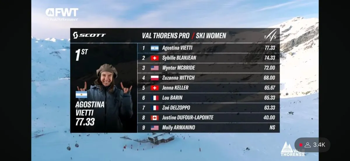 En Val Thorens, una de las sedes más exigentes del calendario, Agostina superó a referentes internacionales como la suiza Sybille Blanjean y la estadounidense Wynter McBride, destacándose por su elección de línea, fluidez, técnica y control en una bajada de alta complejidad.