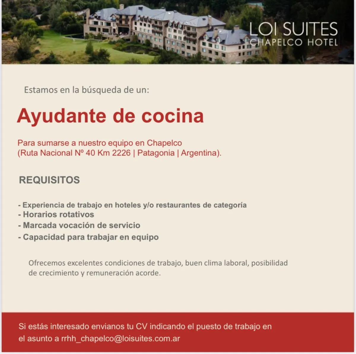 Aviso laboral Ayudante de cocina para Loi Suites Chapelco Hotel BOLSA DE TRABAJO 30/01/2026 Temas San Martín de los Andes trabajo Te puede interesar Aviso laboral Chofer de taxi Aviso laboral Empleado/a para heladería Aviso laboral Personal administrativo para Préstamos Valor Global Aviso laboral Ayudante de cocina para Hotel Patagonia Plaza Aviso laboral Personal masculino para comercio Aviso laboral Medio jornada recepción Aviso laboral Personal de limpieza Aviso laboral Chofer de taxi Últimas noticias Conflicto gremial destrabado Tras una reunión con el intendente Saloniti, se normalizan los servicios municipales en San Martín de los Andes Conflicto institucional en el fútbol argentino La AFA anunció un paro de cuatro días y suspendió la fecha 9 de la Liga Profesional Siniestro vial en la cordillera Fatal choque en la Ruta 60: una mujer murió y cuatro personas resultaron gravemente heridas Infraestructura rural Neuquén espera la autorización nacional para iniciar la pasarela sobre el Cuyín Manzano Pronóstico regional Ingresa aire frío y húmedo en la cordillera y anticipan lluvias hacia fin de mes Aviso laboral Chofer de taxi