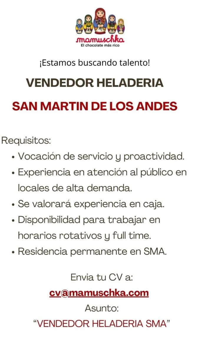 Aviso laboral Vendedor heladería para Mamuschka BOLSA DE TRABAJO 03/02/2026 Te puede interesar Aviso laboral Chofer de taxi Aviso laboral Empleado/a para heladería Aviso laboral Personal administrativo para Préstamos Valor Global Aviso laboral Ayudante de cocina para Hotel Patagonia Plaza Aviso laboral Personal masculino para comercio Aviso laboral Medio jornada recepción Aviso laboral Personal de limpieza Aviso laboral Chofer de taxi Últimas noticias Conflicto gremial destrabado Tras una reunión con el intendente Saloniti, se normalizan los servicios municipales en San Martín de los Andes Conflicto institucional en el fútbol argentino La AFA anunció un paro de cuatro días y suspendió la fecha 9 de la Liga Profesional Siniestro vial en la cordillera Fatal choque en la Ruta 60: una mujer murió y cuatro personas resultaron gravemente heridas Infraestructura rural Neuquén espera la autorización nacional para iniciar la pasarela sobre el Cuyín Manzano Pronóstico regional Ingresa aire frío y húmedo en la cordillera y anticipan lluvias hacia fin de mes Aviso laboral Chofer de taxi