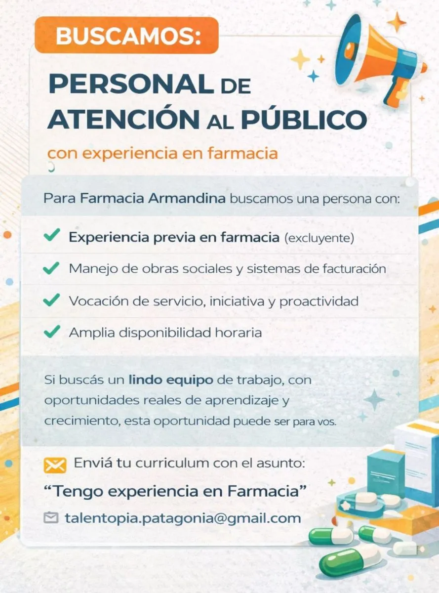 Aviso laboral Atención al público para farmacia BOLSA DE TRABAJO 06/02/2026 Te puede interesar Aviso laboral Chofer de taxi Aviso laboral Empleado/a para heladería Aviso laboral Personal administrativo para Préstamos Valor Global Aviso laboral Ayudante de cocina para Hotel Patagonia Plaza Aviso laboral Personal masculino para comercio Aviso laboral Medio jornada recepción Aviso laboral Personal de limpieza Aviso laboral Chofer de taxi Últimas noticias Conflicto gremial destrabado Tras una reunión con el intendente Saloniti, se normalizan los servicios municipales en San Martín de los Andes Conflicto institucional en el fútbol argentino La AFA anunció un paro de cuatro días y suspendió la fecha 9 de la Liga Profesional Infraestructura rural Neuquén espera la autorización nacional para iniciar la pasarela sobre el Cuyín Manzano Pronóstico regional Ingresa aire frío y húmedo en la cordillera y anticipan lluvias hacia fin de mes Aviso laboral Chofer de taxi