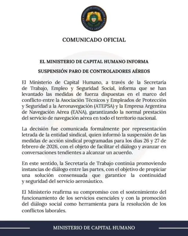 El Ministerio de Capital Humano confirmó este jueves la suspensión del paro de controladores aéreos que había sido anunciado para los días 26 y 27 de febrero, en el marco del conflicto entre la Asociación Técnicos y Empleados de Protección y Seguridad a la Aeronavegación (ATEPSA) y la Empresa Argentina de Navegación Aérea (EANA).