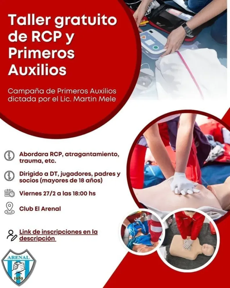 El Club El Arenal invita a participar de un Taller gratuito de RCP y Primeros Auxilios, una iniciativa pensada para brindar herramientas fundamentales ante situaciones de emergencia.