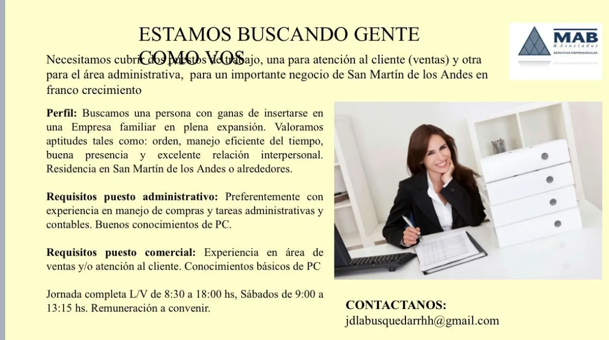 Aviso laboral Búsqueda administrativa y de ventas BOLSA DE TRABAJO 02/03/2026 Te puede interesar Aviso laboral Personal para lavadero Avisos laborales Personal para Unser Traum Aviso laboral Oficial albañil y soldador Aviso laboral Vendedor/a viajante Aviso laboral COTESMA seleccionará: Auxiliar de Ingeniería de Redes Aviso laboral Personal para Café Delirante Aviso laboral Chofer de taxi Últimas noticias Anuncios Leticia Estevez: “Ordenamos el Estado para invertir donde realmente hace falta” El Gobierno nacional ratificó que la cuestión salarial es competencia de las provincias Salud visual Neuquén y Nación refuerzan el plan de salud visual con dos unidades móviles Seguridad Neuquén incorpora Taser para fortalecer el accionar policial Incendios forestales en Neuquén Más de 100 incendios y rápida respuesta: el 29% fue extinguido en menos de dos horas