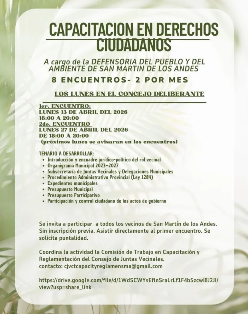 La Defensoría del Pueblo y del Ambiente de San Martín de los Andes lanzó una propuesta de formación abierta a la comunidad: una capacitación en derechos ciudadanos, que se desarrollará a lo largo de varios encuentros en el Concejo Deliberante.