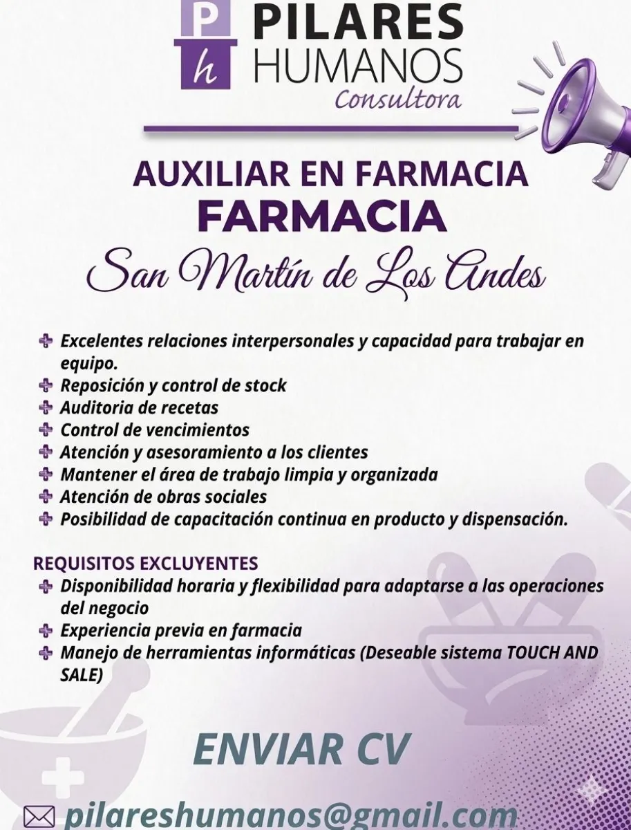 Aviso laboral Auxiliar en farmacia BOLSA DE TRABAJO 11/04/2026 Te puede interesar Aviso laboral Empleado/a administrativo/a - Repartidor Aviso laboral Personal de mantenimiento Aviso laboral Empleada/o administrativa/o Aviso laboral Preventista para distribuidora Aviso laboral Ventas y atención al público para DelTurista Aviso laboral Cargo en Centro de Formación Profesional N° 19 Aviso laboral Eléctrico de obra Últimas noticias Aviso laboral Empleado/a administrativo/a - Repartidor Infraestructura vial La pavimentación de la Ruta Provincial 65 ya supera el 50% de ejecución Acuerdo con gremio vial El Gobierno entregó el estatuto de Aéreo Neuquén S.A. y el gremio propuso suspender medidas de fuerza Parque Nacional Nahuel Huapi Alertan por nevadas para la madrugada del domingo Salud “Lo que no se resuelve, se repite”: invitan a un taller para trabajar los vínculos en San Martín de los Andes