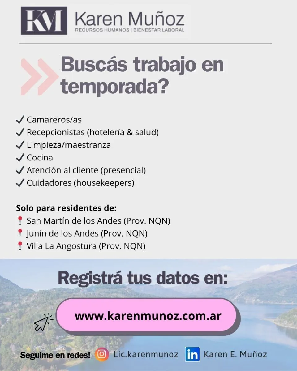 Aviso laboral Varios para temporada para Karen Muñoz RRHH BOLSA DE TRABAJO 14/04/2026 Te puede interesar Aviso laboral Varios para Restaurante en Lolog Aviso laboral Auxiliar en farmacia Aviso laboral Empleado/a administrativo/a - Repartidor Aviso laboral Personal de mantenimiento Aviso laboral Empleada/o administrativa/o Aviso laboral Preventista para distribuidora Aviso laboral Ventas y atención al público para DelTurista